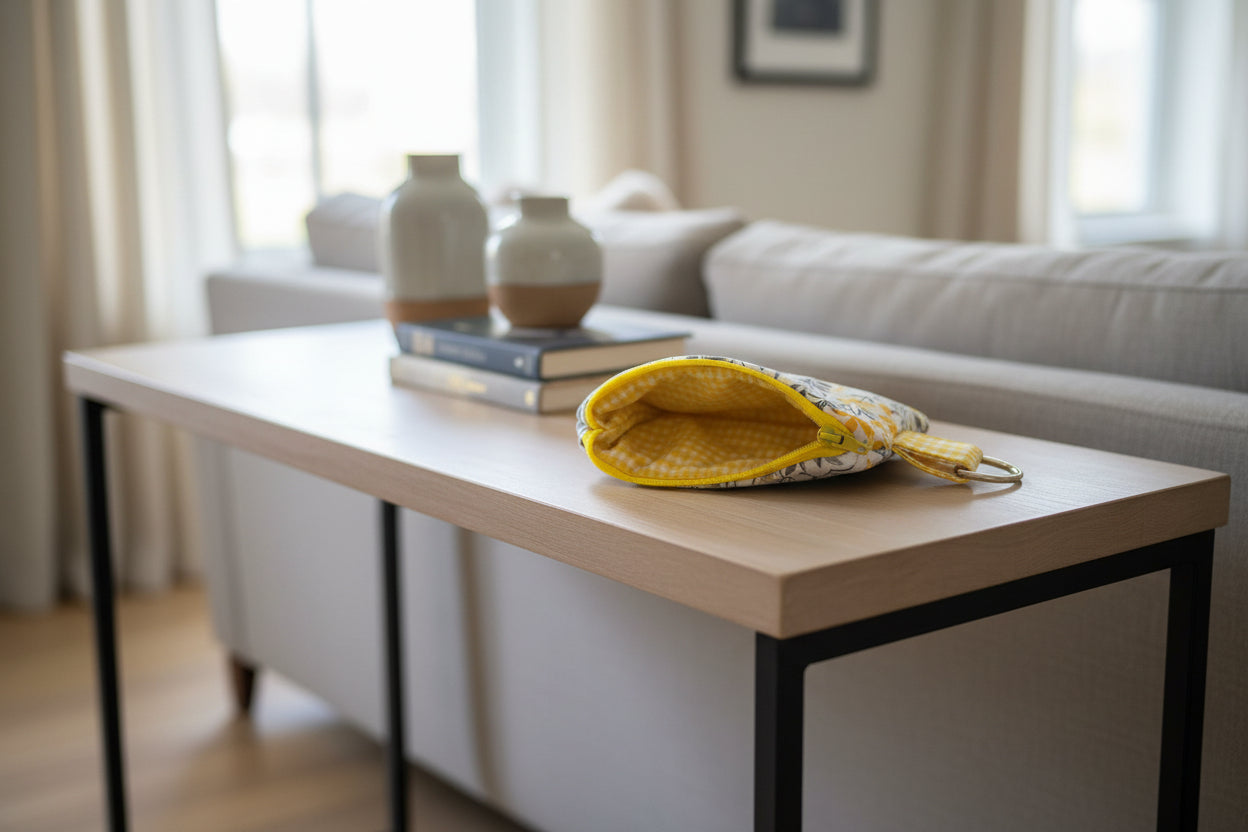 This beautifully crafted pouch features sunny yellow florals with blue and gray leaves on the exterior, paired with a classic yellow gingham lining that adds a charming, vintage-inspired detail. Perfect for those who love bright, cheerful botanical designs with a touch of timeless style.